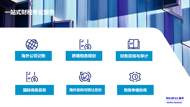 RICHFUL瑞豐財稅交付服務團隊基于其全球服務網絡以及豐富的實務經驗,協助不同國際化階段的中國企業結合戰略、商業、法律、合規等綜合因素,幫助企業在海外發展進程中作出最優化的稅務考量。