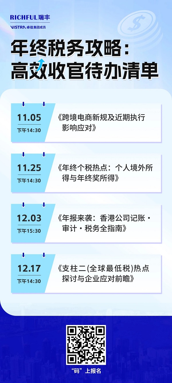 “年終稅務攻略:高效收官待辦清單”系列網絡研討會持續進行中,首場已圓滿落幕,干貨滿滿,好評如潮!第二場即將開啟,助你系統梳理關鍵議題,為2025年穩健發展夯實基礎。